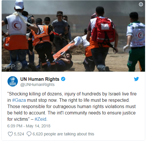 Οι θάνατοι σχεδόν εξήντα παλαιστίνιων διαδηλωτών από τις σφαίρες, τα δακρυγόνα και τα άλλα μέσα που χρησιμοποίησαν οι άνδρες του ισραηλινού στρατού στα σύνορα με τη Λωρίδα της Γάζας τη Δευτέρα προκάλεσαν έντονες διπλωματικές αντιδράσεις, ιδίως στην Τουρκία και στη Νότια Αφρική, οι κυβερνήσεις των οποίων ανακάλεσαν τους πρεσβευτές τους στο Ισραήλ, ενώ από την άλλη, οι ΗΠΑ επέρριψαν την ευθύνη στο παλαιστινιακό ισλαμιστικό κίνημα Χαμάς.