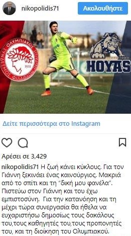 «Η ζωή κάνει κύκλους.Για τον Γιάννη ξεκινάει ένας καινούργιος.Μακριά από το σπίτι και τη “δική μου φανέλα”.Πιστεύω στον Γιάννη και του έχω εμπιστοσύνη.