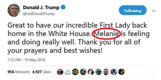 …αλλά ο Τραμπ αναγκάστηκε να το διαγράψει άρον-άρον, όταν διαπίστωσε ότι είχε γράψει λάθος το όνομα της Μελάνια. Όχι όμως αρκετά γρήγορα ώστε το Twitter να μην προλάβει να το κρατήσει και να τον τρολάρει αλύπητα.