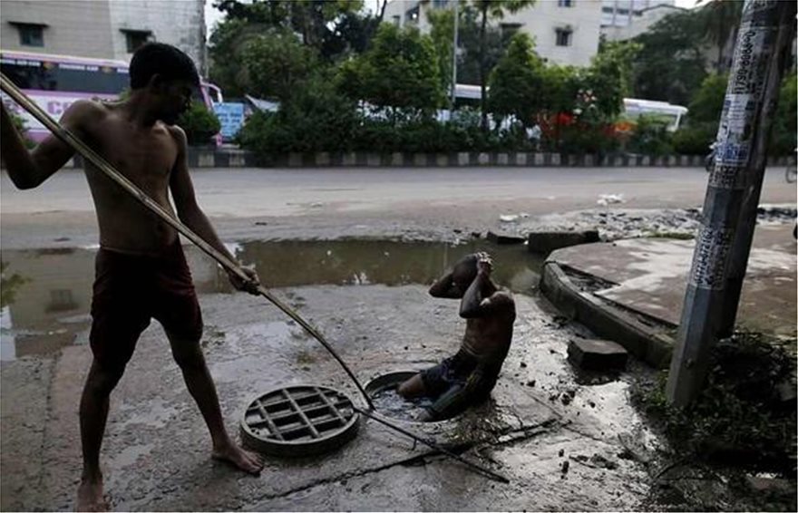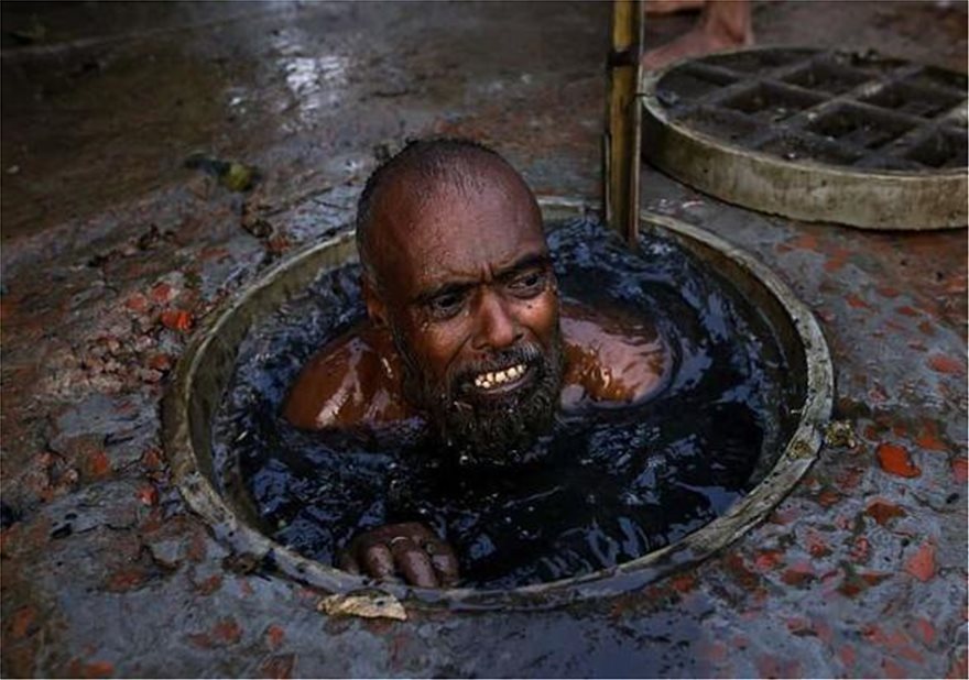 Ο εικονιζόμενος είναι επαγγελματίας και η δουλειά του είναι να κρατά την αναπνοή του όσο περισσότερο μπορεί κάτω από ανθρώπινα και χημικά απόβλητα στους υπονόμους της Ντάκα.