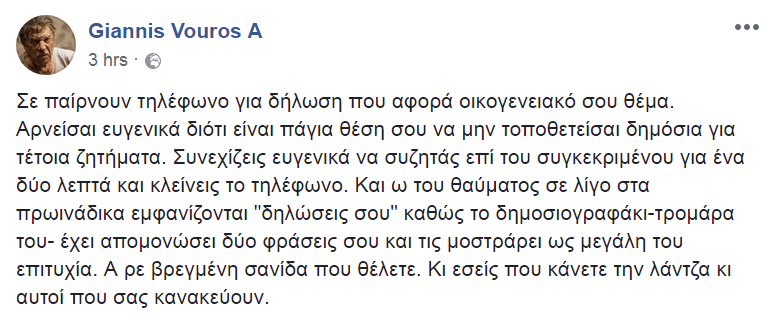 Δεν επιβεβαιώνει το γεγονός της εγκυμοσύνη της κόρης του ο ηθοποιός Γιάννης Βούρος, καθώς όπως αναφέρει σε ανάρτησή στο facebook, οι δηλώσεις του απομονώθηκαν.