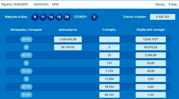 Τζακ ποτ σημειώθηκε στην κλήρωση της Πέμπτης στο Τζόκερ, αφού δεν βρέθηκε νικητής στην πρώτη κύρια κατηγορία.