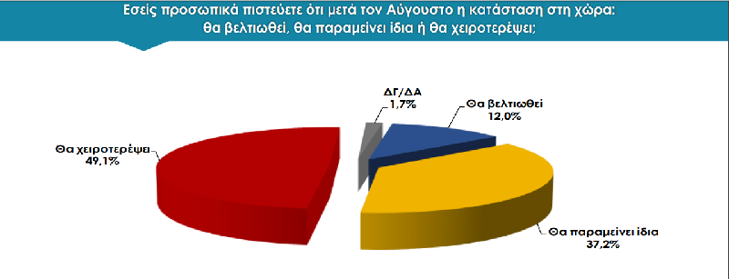 Από τα υπόλοιπα στοιχεία της δημοσκόπησης ενδιαφέρον παρουσιάζει το γεγονός ότι οι πολίτες εμφανίζοντα απαισιόδοξοι σε σχέση με την κατάσταση που θα διαμορφωθεί στη χώρα, μετά τον Αύγουστο και την έξοδο από το Μνημόνιο. Μόνο το 12% των ερωτηθέντων θεωρούν ότι η κατάσταση θα βελτιωθεί, έναντι 49,1% που πιστεύουν ότι θα χειροτερέψει και 37,2% πιστεύουν ότι θα παραμείνει ίδια.