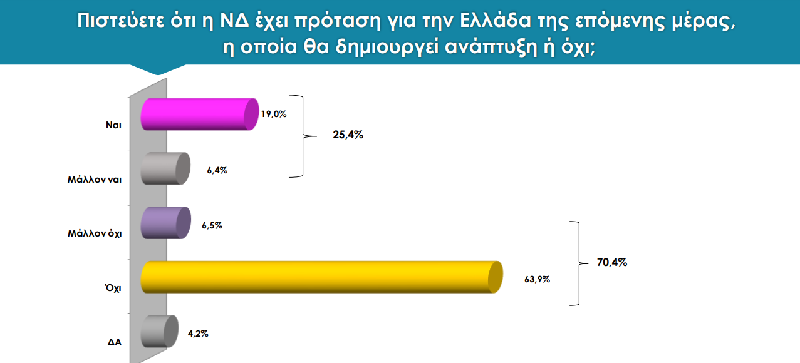Πάντως, ούτε και η πρόταση της ΝΔ φαίνεται να γεμίζει με αισιοδοξία της πολίτες, καθώς το 70,4% δηλώνει ότι δεν θεωρεί ότι η αντιπολίτευση έχει πρόταση που θα δημιουργεί ανάπτυξη.