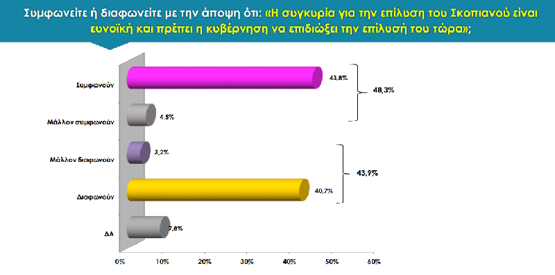 Σε ό,τι αφορά στο Σκοπιανό η κοινή γνώμη εμφανίζεται διχασμένη, καθώς το 48,3% των ερωτηθέντων θεωρούν ότι η συγκυρία είναι ευνοϊκή και η κυβέρνηση πρέπει να επιδιώξει την επίλυσή του τώρα, ενώ το 43,9% διαφωνεί με αυτήν την άποψη.