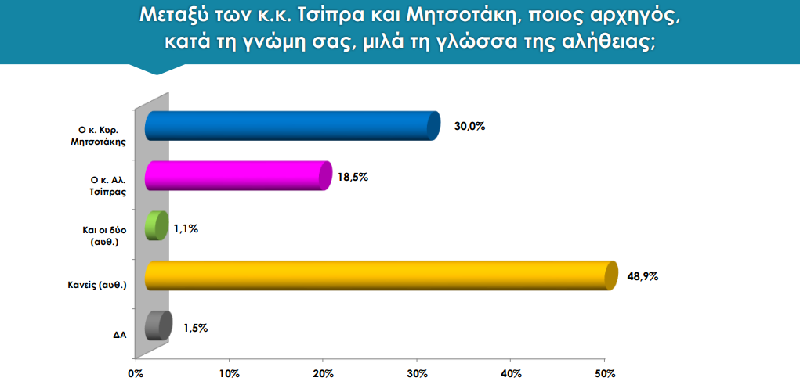Στο ερώτημα ποιος από τους δύο μιλάει την γλώσσα της αλήθειας ο αρχηγός της αξιωματικής αντιπολίτευσης συγκεντρώνει 30% και ο Πρωθυπουργός 18,5%. Ένας στους δύο ψηφοφόρους (το 48,9%) απαντά «κανένας από τους δύο».
