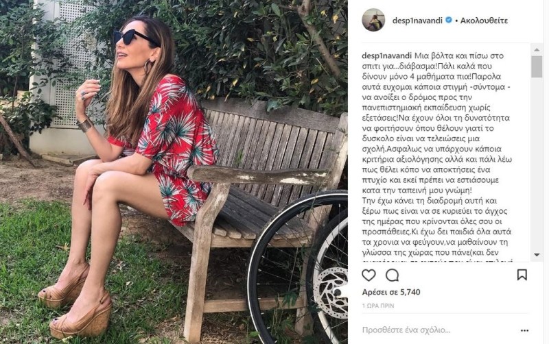 Ο λόγος για τη γνωστή τραγουδίστρια Δέσποινα Βανδή, η οποία «κατακεραύνωσε» μέσω ανάρτησής της στο Instagram το σύστημα των πανελλαδικών εξετάσεων για την εισαγωγή των υποψηφίων στα ανώτατα εκπαιδευτικά ιδρύματα.
