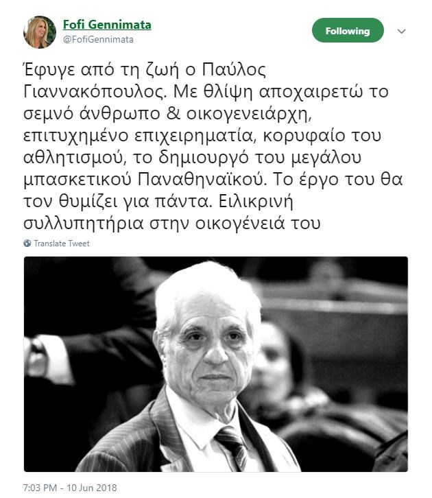 «Έφυγε από τη ζωή ο Παύλος Γιαννακόπουλος. Με θλίψη αποχαιρετώ το σεμνό άνθρωπο και οικογενειάρχη, επιτυχημένο επιχειρηματία, κορυφαίο του αθλητισμού, το δημιουργό του μεγάλου μπασκετικού Παναθηναϊκού. Το έργο του θα τον θυμίζει για πάντα. Ειλικρινή συλλυπητήρια στην οικογένειά του», τόνισε η Φώφη Γεννηματά.
