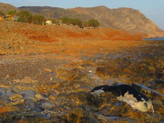 Μια νεκρή αγελάδα ξέβρασε το κύμα επάνω στα βράχια στην παραλία Ανωγείων στην περιοχή του Αγίου Αντωνίου το πρωί της Δευτέρας.