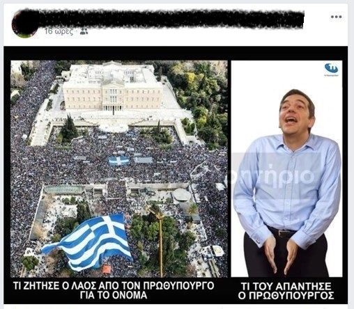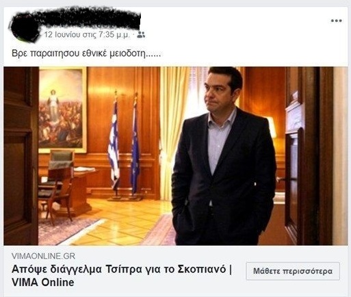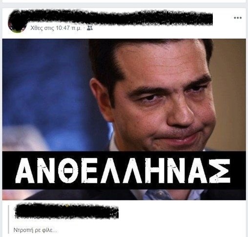 Δεν διστάζει μάλιστα να κοινοποιήσει μια δημοσίευση που απεικονίζει τον πρωθυπουργό να κάνει μια αισχρή χειρονομία απαντώντας έτσι δήθεν στο αίτημα του ελληνικού λαού για το όνομα της ΠΓΔΜ.