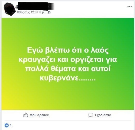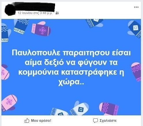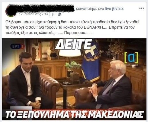 Συγκεκριμένα, σύμφωνα με το Documento, o υπό έρευνα αντεισαγγελέας με αναρτήσεις του στον προσωπικό του λογαριασμό στο Facebook κάνει λόγο για “κομμούνια” από τα οποία “καταστράφηκε η χώρα” και πρέπει “να φύγουν”, ζητάει την παραίτηση του Προέδρου της Δημοκρατίας, Προκόπη Παυλόπουλου, και την παραίτηση του Πρωθυπουργού τον οποίο αποκαλεί “εθνικό μειοδότη”.