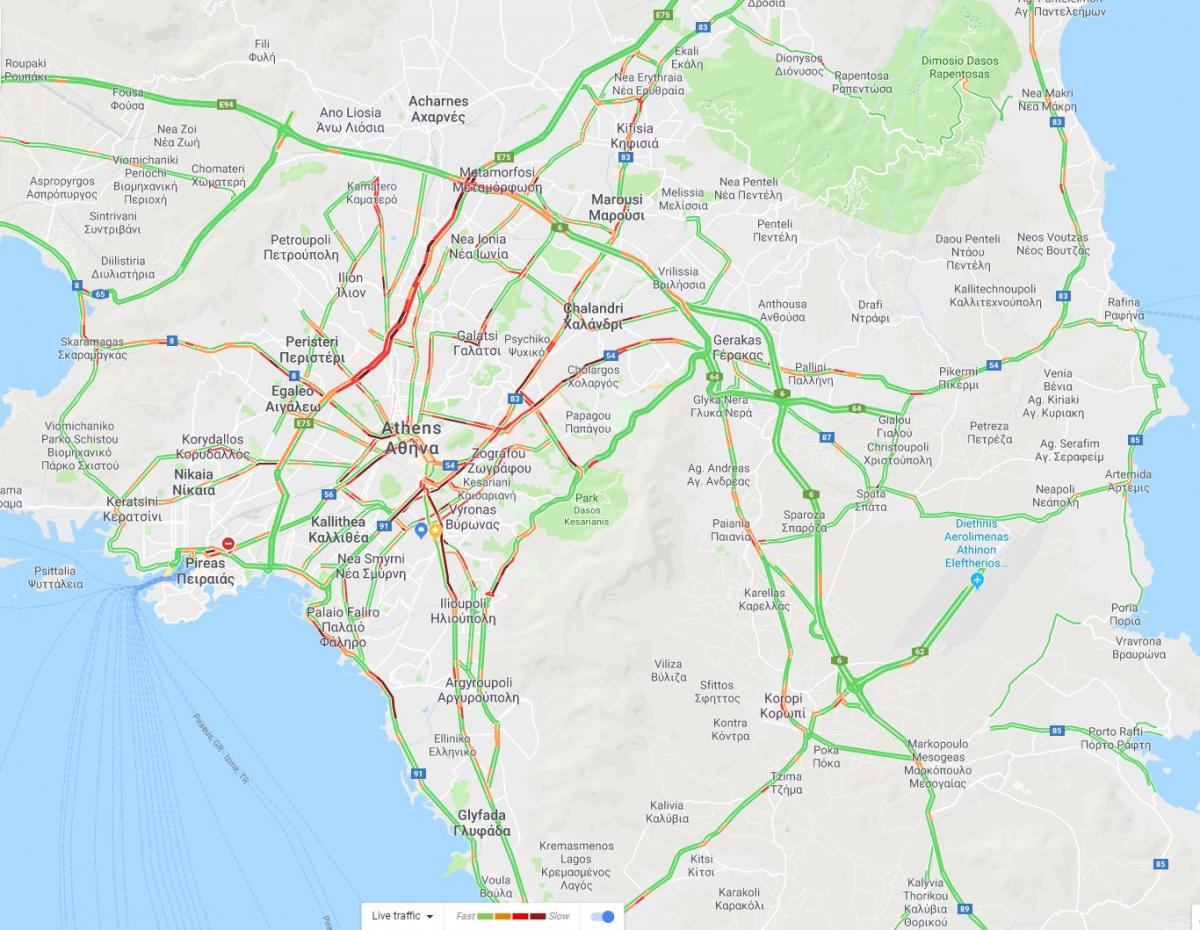 Live η κίνηση στους δρόμους της Αθήνας (κάντε κλικ στους χάρτες).