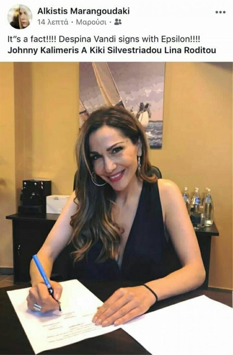 H Άλκηστις Μαραγκουδάκη ανακοίνωσε σε ανάρτηση στην προσωπική της σελίδα στο Facebook ότι η γνωστή τραγουδίστρια Δέσποινα Βανδή, υπέγραψε με το κανάλι του Epsilon.