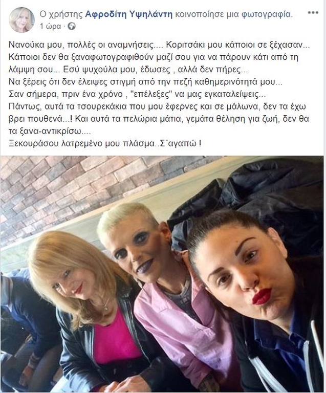 Ένα από τα πιο αγαπημένα της πρόσωπα, η δημοσιογράφος Αφροδίτη Υψηλάντη έγραψε στον προσωπικό της λογαριασμό στο facebook: