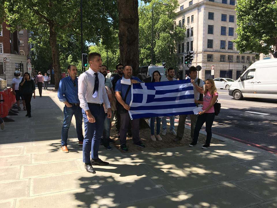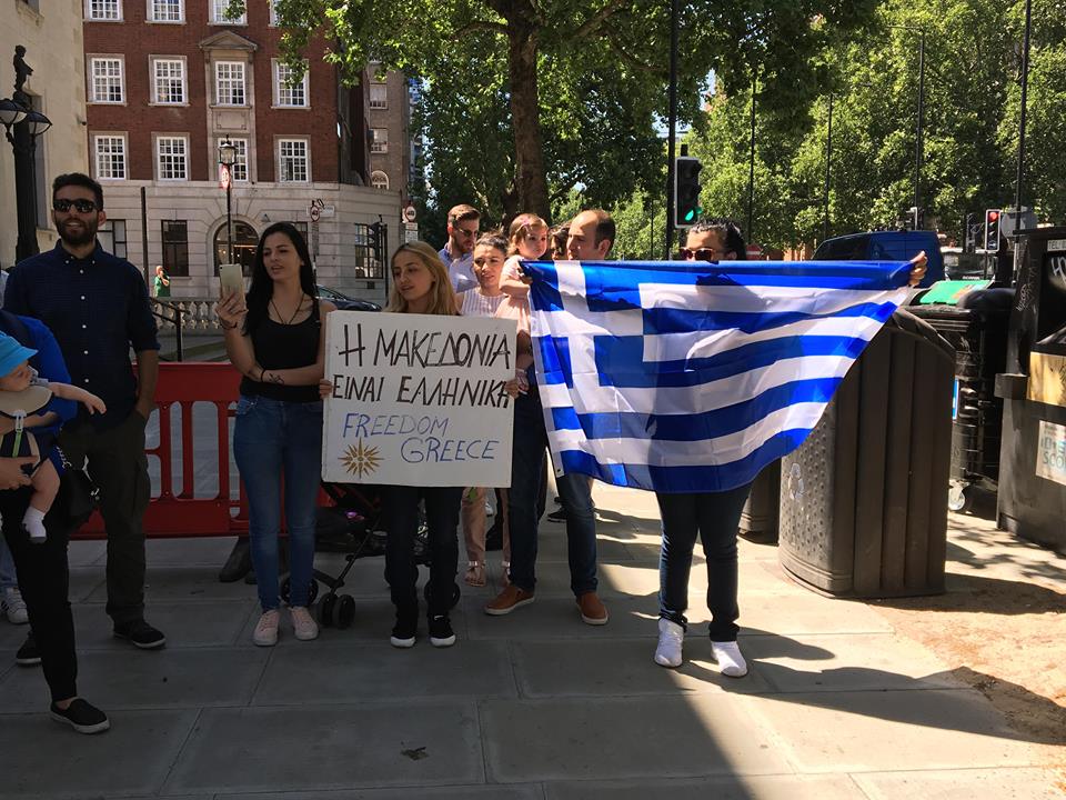 Οι διαδηλωτές διαμαρτύρονται για τη συμφωνία για την ονομασία των Σκοπίων, κρατώντας μια μεγάλη ελληνική σημαία. Οι διαδηλωτές φωνάζουν συνθήματα όπως «Ελλάς, Ελλάς Μακεδονία», «Η Μακεδονία είναι ελληνική» και «Τσίπρα προδότη, Ιούδα Ισκαριώτη» και τραγουδάνε το «Μακεδονία Ξακουστή».
