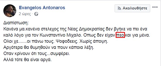 Όπως θα παρατηρήσατε, τον Ευάγγελο Αντώναρο τον «πρόδωσε» το κινητό του, αφού αντί για «πει» έγραψε «πεο».