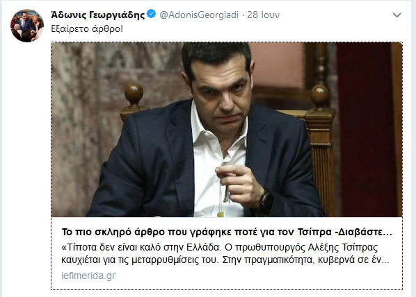 Τη σφοδρή αντίδραση του ΣΥΡΙΖΑ προκάλεσε ανάρτηση στο Twitter του αντιπροέδρου της ΝΔ Άδωνι Γεωργιάδη, ο οποίος αναδημοσίευσε άρθρο έντονα επικριτικό για την κυβέρνηση, με το σχόλιο «εξαιρετικό άρθρο».