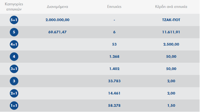 Στην επόμενη κλήρωση οι νικητές της πρώτης κατηγορίας θα μοιραστούν το ποσό τουλάχιστον των δύο εκατ. ευρώ.