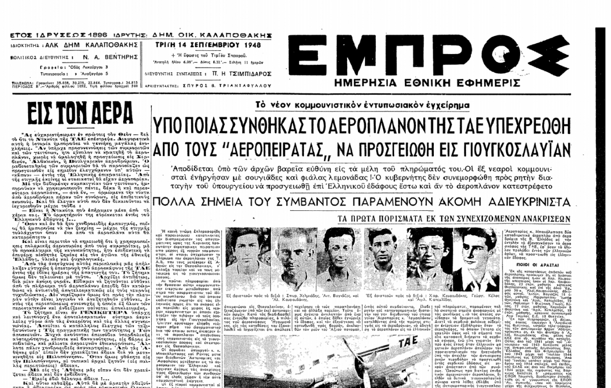 Η πρώτη αεροπειρατεία στην Ελλάδα και μία από τις πρώτες παγκοσμίως, έγινε από 6 νεαρούς κομουνιστές στις 12 Σεπτεμβρίου 1948, κατά τη διάρκεια του Εμφυλίου Πολέμου.
