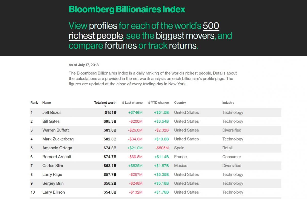 Κατά το άνοιγμα των χρηματοπιστωτικών αγορών στις 27 Ιουλίου 2017, ο Μπέζος ξεπέρασε για λίγο τον Μπιλ Γκέιτς και έγινε ο πλουσιότερος άνθρωπος του κόσμου, με εκτιμώμενη περιουσία λίγω πάνω από 90 δισ. δολάρια.[5]Αργότερα την ίδια ημέρα έχασε τον τίτλο καθώς τα έσοδα της Amazon μειώθηκαν και τελικά έμεινε στην δεύτερη θέση με λίγο κάτω από τα 90 δισ. δολάρια.