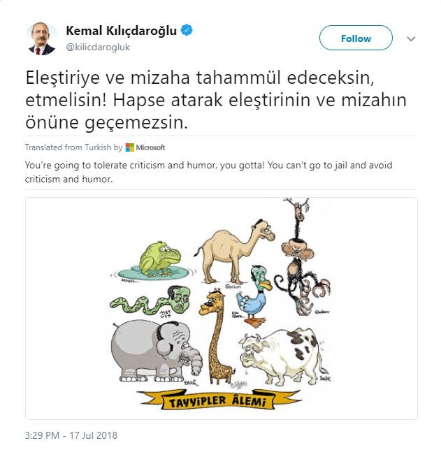 Συγκεκριμένα, εισαγγελική έρευνα για προσβολή του Ερντογάν έχει διαταχθεί για το σκίτσο που ανέβασε στο Twitter, ο αρχηγός της αξιωματικής αντιπολίτευσης της Τουρκίας, Κεμάλ Κιλιτσντάρογλου.