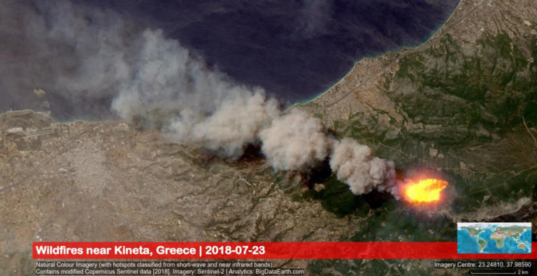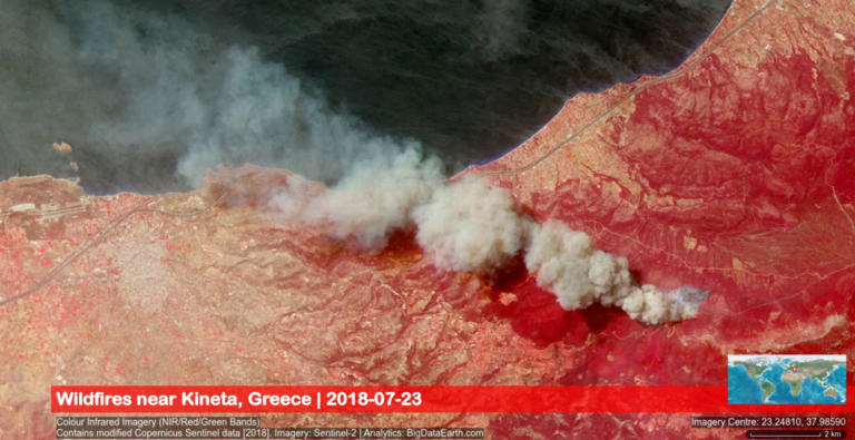 Οι λήψεις έγιναν από τον δορυφόρο sentinel2 και σε ορισμένες περιοχές η θερμότητα που δημιουργείται είναι τόσο μεγάλη που εμφανίζεται με κόκκινο χρώμα.