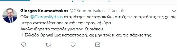 Συγκεκριμένα, ο κ. Κουμουτσάκος έγραψε στον προσωπικό του λογαριασμό: «Φίλε @GiorgosKyrtsos σταμάτησε σε παρακαλώ αυτές τις αναρτήσεις της χωρίς μέτρο αντιπολίτευσης αυτήν την τραγική ώρα. Ακολούθησε το παράδειγμα του Κυριάκου. Η Ελλάδα θρηνεί μια καταστροφή, ας μην τρώει και τις σάρκες της».