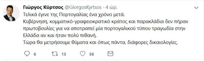 Νωρίτερα, ο κ. Κύρτσος είχε αναρτήσει σειρά tweet με τα οποία ασκούσε κριτική στην κυβέρνηση. Χαρακτηριστικό είναι το tweet: «Τελικά έγινε της Πορτογαλίας, έναν χρόνο μετά. Κυβέρνηση, κομματικό-γραφειοκρατικό κράτος και παρακλάδια δεν πήραν πρωτοβουλίες για να αποτραπεί μία πορτογαλικού τύπου τραγωδία στην Ελλάδα αν και ήταν πολύ πιθανή. Τώρα θα μετρήσουμε θύματα και, όπως πάντα, διάφορες δικαιολογίες».
