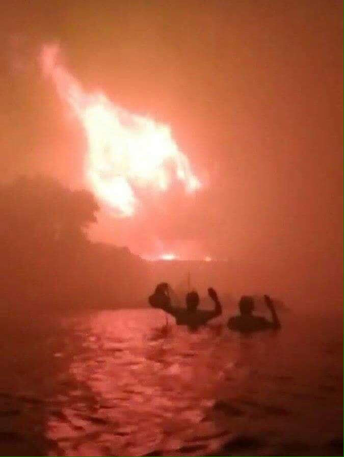Η φωτογραφία δείχνει δύο ανθρώπους μέσα στην θάλασσα. Η ατμόσφαιρα είναι καλυμμένη με καπνούς και οι φλόγες έχουν φτάσει μέχρι την παραλία.