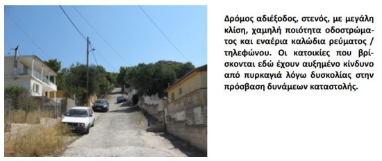 Ο δρόμος που οδηγεί στην κατοικία είναι ζωτικής σημασίας σε περίπτωση πυρκαγιάς. Αυτό συμβαίνει διότι καθορίζει την ευκολία πρόσβασης και απομάκρυνσης από το σπίτι. Η πρόσβαση είναι ιδιαίτερα σημαντική για τα οχήματα που συμμετέχουν στην καταστολή της πυρκαγιάς (Πυροσβεστική, υδροφόρες Δήμου, οχήματα Εθελοντικών Οργανώσεων) και την απομάκρυνση για τους κατοίκους του σπιτιού, εφόσον κριθεί επισφαλής η παραμονή τους στο χώρο. Συνοπτικά, τα αρνητικά χαρακτηριστικά των δρόμων σε περιοχές μίξης Δασών – Οικισμών είναι: