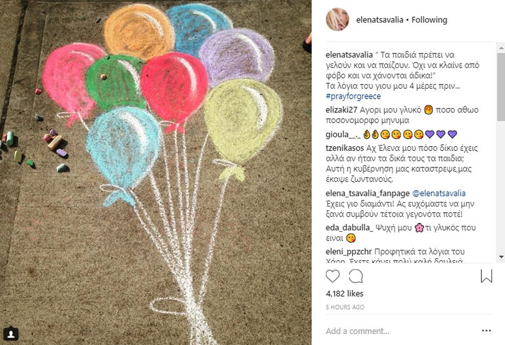 Τα λόγια του γιου μου 4 μέρες πριν… #prayforgreece» έγραψε η ηθοποιός και παρουσιάστρια στον προσωπικό της λογαριασμό στο instagram ανεβάζοντας μία παιδική ζωγραφιά από κιμωλία στην οποία απεικονίζονται πολύχρωμα μπαλόνια.