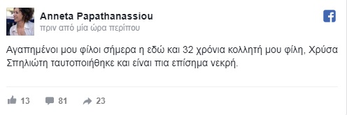 «Αγαπημένοι μου φίλοι σήμερα η εδώ και 32 χρόνια κολλητή μου φίλη, Χρύσα Σπηλιώτη ταυτοποιήθηκε και είναι πια επίσημα νεκρή».