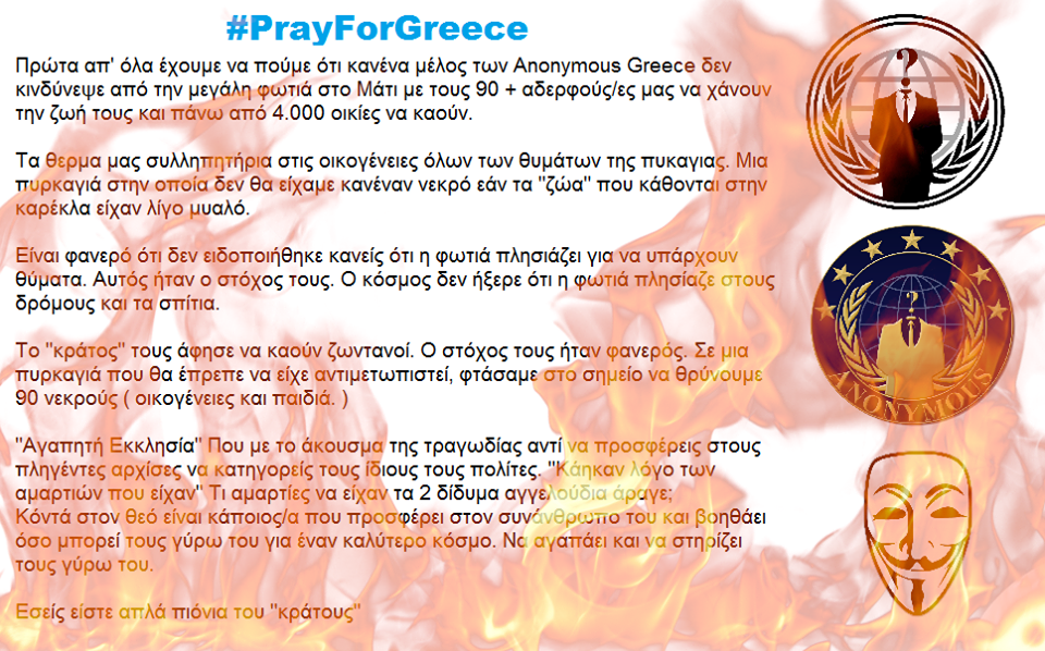 Πρώτα απ’ όλα έχουμε να πούμε ότι κανένα μέλος των Anonymous Greece δεν κινδύνεψε από την μεγάλη φωτιά στο Μάτι με τους 90 + αδερφούς/ες μας να χάνουν την ζωή τους και πάνω από 4.000 οικίες να καούν. Τα θερμά μας συλλυπητήρια στις οικογένειες όλων των θυμάτων της πυρκαγιάς. Μια πυρκαγιά στην οποία δεν θα είχαμε κανέναν νεκρό εάν τα “ζώα” που κάθονται στην καρέκλα είχαν λίγο μυαλό. Είναι φανερό ότι δεν ειδοποιήθηκε κανείς ότι η φωτιά πλησιάζει για να υπάρχουν θύματα. Αυτός ήταν ο στόχος τους. Ο κόσμος δεν ήξερε ότι η φωτιά πλησίαζε στους δρόμους και τα σπίτια. Το “κράτος” τους άφησε να καούν ζωντανοί. Ο στόχος τους ήταν φανερός. Σε μια πυρκαγιά που θα έπρεπε να είχε αντιμετωπιστεί, φτάσαμε στο σημείο να θρηνούμε 90 νεκρούς ( οικογένειες και παιδιά. )