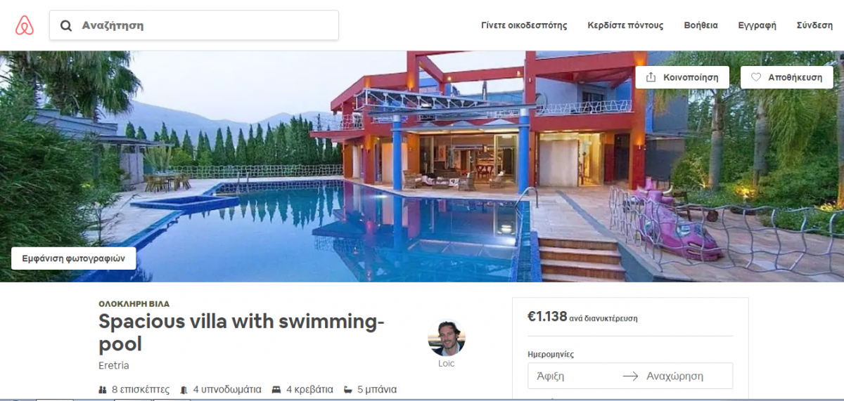 Όπως φαίνεται στην πλατφόρμα Airbnb, το σπίτι νοικιάζεται για 1.138 ευρώ τη βραδιά. Εάν ο επισκέπτης του προκαλέσει φθορές, τότε θα πληρώσει αποζημίωση που αγγίζει ακόμη κα τις 4.180 ευρώ.