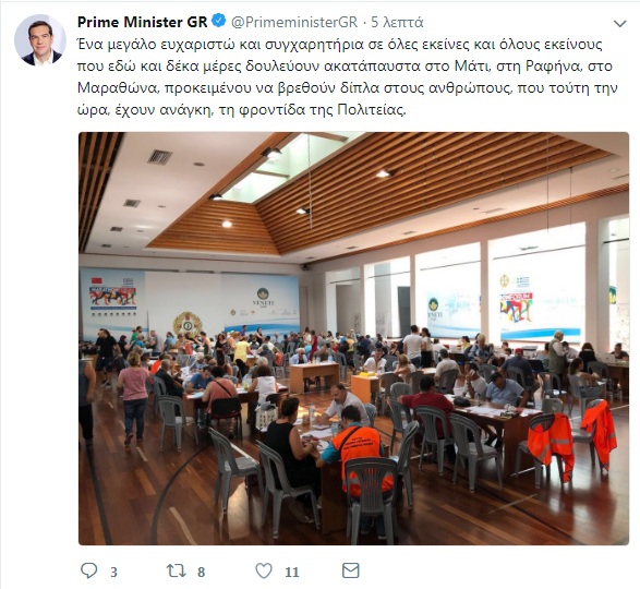Σε νεότερη ανάρτησή του στο Twitter, ο πρωθυπουργός ευχαρίστησε όσους εργάζονται ακατάπαυστα όλες αυτές τις μέρες σε Μάτι, Ραφήνα και μαραθώνα: