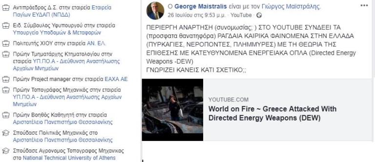 Ο κ. Μαϊστράλης φαίνεται να αναζητά θεωρίες συνωμοσίας για το τι συνέβη με τις πυρκαγιές. Το στέλεχος των ΑΝ.ΕΛ ανήρτησε βίντεο από το youtube και αναρωτήθηκε αν οι πυρκαγιές οφείλονται σε επίθεση από «κατευθυνόμενα ενεργειακά όπλα».