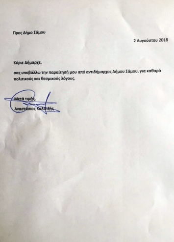 Στην επιστολή του προς τον Δήμαρχο Σάμου, Μιχάλη Αγγελόπουλο, αναφέρει: «Κύριε Δήμαρχε, σας υποβάλλω την παραίτηση μου από αντιδήμαρχος Δήμου Σάμου, για καθαρά πολιτικούς και θεσμικούς λόγους».