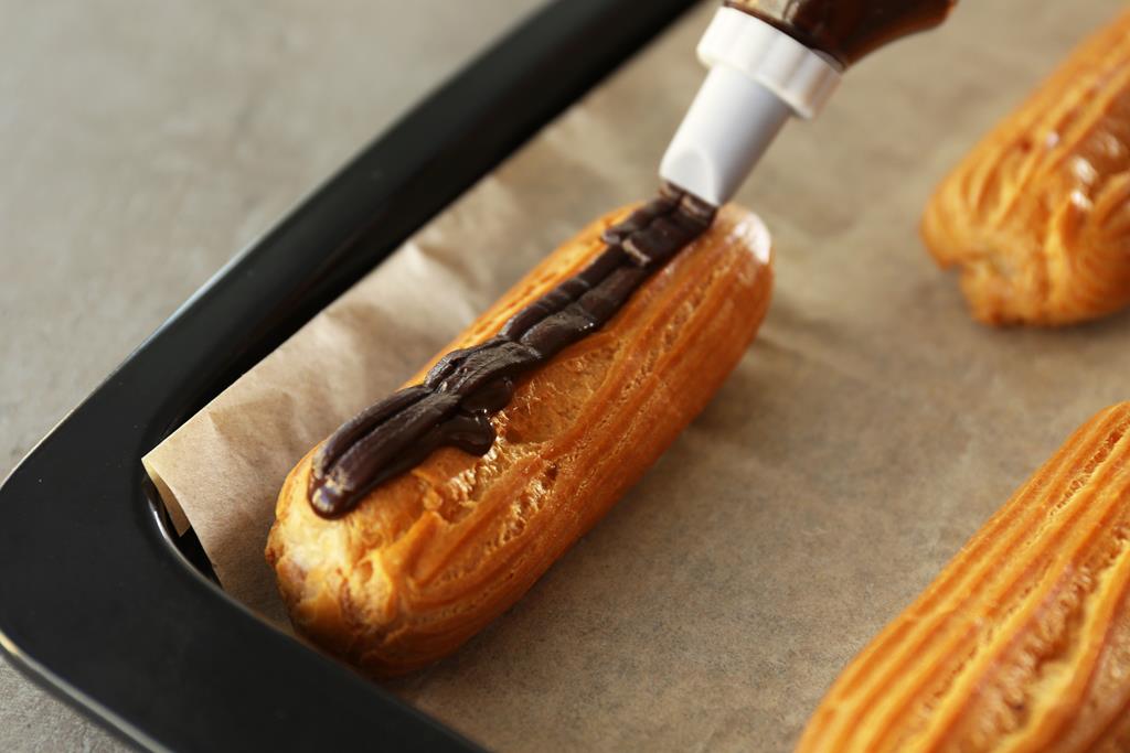 Προθερμαίνουμε τον φούρνο στους 200 βαθμούς. Στη λαμαρίνα του φούρνου στρώνουμε μια λαδόκολλα και με τη βοήθεια ενός κορνέ απλώνουμε τα εκλέρ . Τα αλείφουμε με τον κρόκο αυγού και ψήνουμε 20-30 λεπτά.