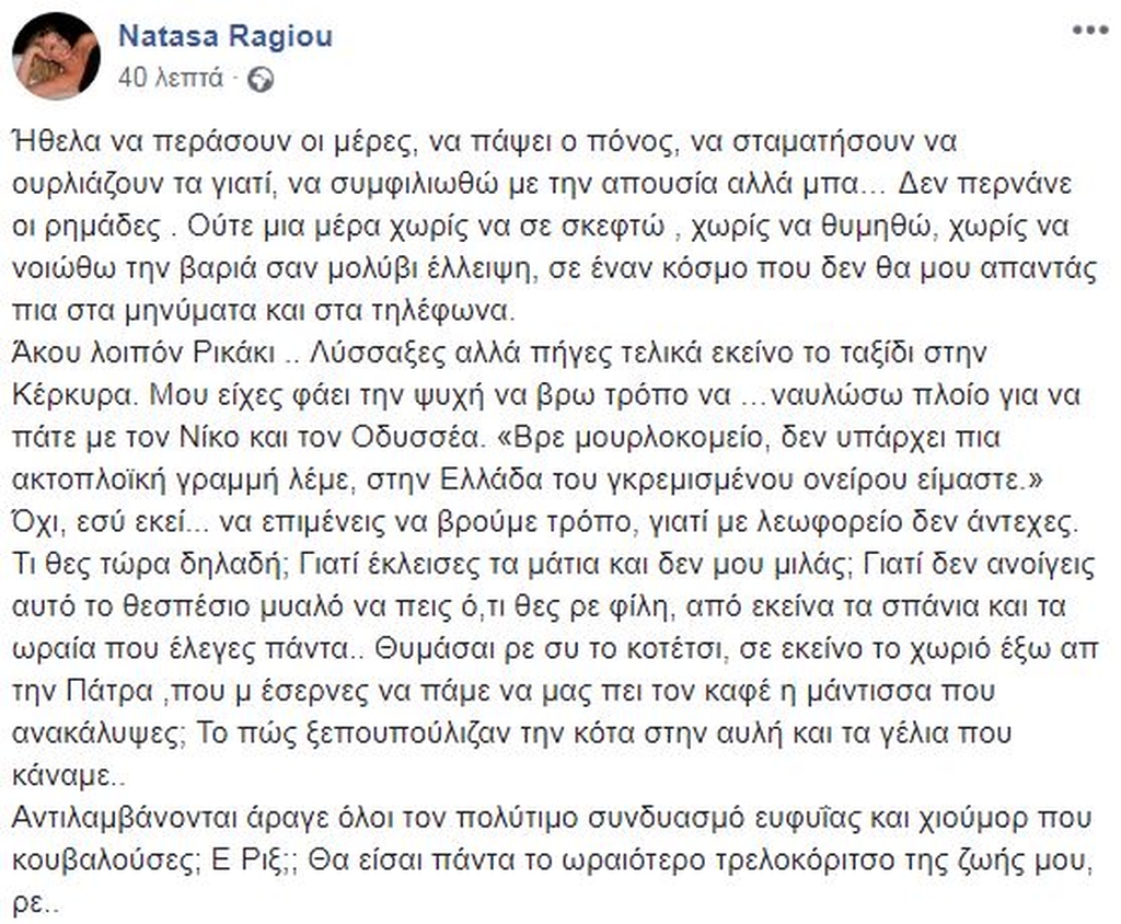 «Ήθελα να περάσουν οι μέρες, να πάψει ο πόνος, να σταματήσουν να ουρλιάζουν τα γιατί, να συμφιλιωθώ με την απουσία αλλά μπα… Δεν περνάνε οι ρημάδες . Ούτε μια μέρα χωρίς να σε σκεφτώ , χωρίς να θυμηθώ, χωρίς να νοιώθω την βαριά σαν μολύβι έλλειψη, σε έναν κόσμο που δεν θα μου απαντάς πια στα μηνύματα και στα τηλέφωνα.