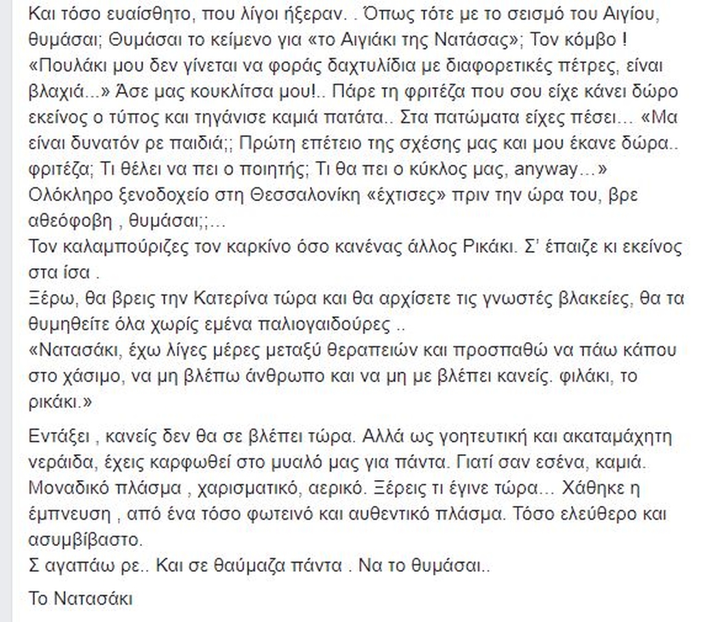«Νατασάκι, έχω λίγες μέρες μεταξύ θεραπειών και προσπαθώ να πάω κάπου στο χάσιμο, να μη βλέπω άνθρωπο και να μη με βλέπει κανείς. φιλάκι, το ρικάκι.»