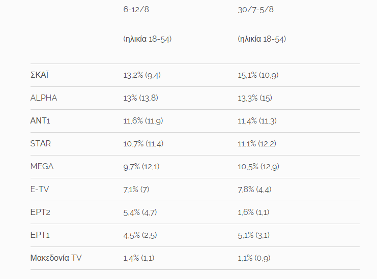 Αναλυτικά, όσα έδειξαν οι πίνακες της Nielsen στα νεανικά κοινά μέχρι το πρώτο μισό του Αυγούστου: