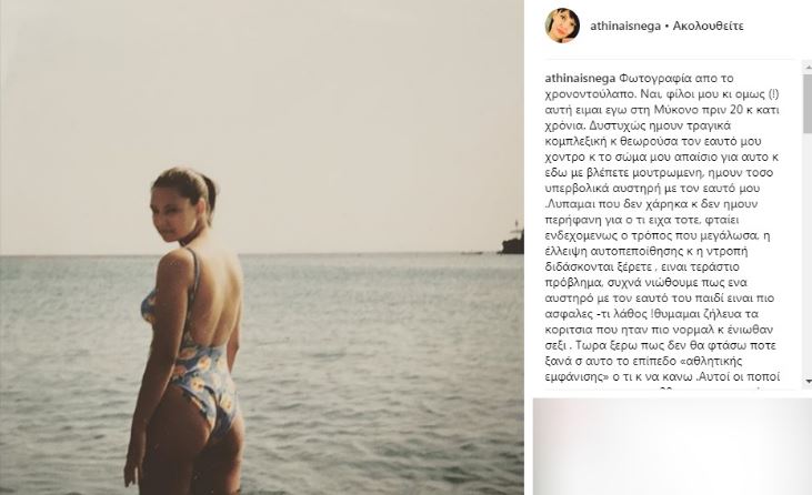 Η φωτογραφία είναι από τότε που η Αθηναΐς ήταν 20 ετών και την δείχνει να μπαίνει στη θάλασσα, φορώντας ένα ολόσωμο μαγιό που αναδεικνύει την όμορφη κορμοστασιά της. Η παρουσιάστρια κάτω από τη φωτογραφία εξήγησε πόσο περίεργα ένιωσε τότε βλέποντας τη φωτογραφία και πόσο ενοχικά ενώ εξήγησε τι μπορεί να έφταιξε για όλο αυτό, δίνοντας το δικό της μήνυμα σε όλα τα κορίτσια…