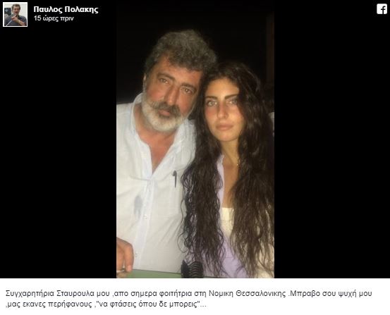«Συγχαρητήρια Σταυρούλα μου, από σήμερα φοιτήτρια στη Νομική Θεσσαλονίκης. Μπράβο σου ψυχή μου, μας έκανες περήφανους , να φτάσεις όπου δε μπορείς» έγραψε χαρακτηριστικά.