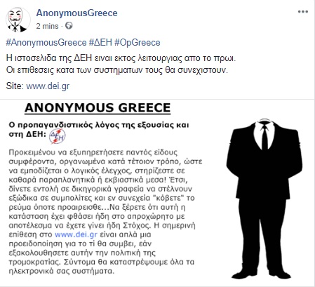Κυβερνοεπίθεση κατά της ιστοσελίδας της ΔΕΗ πραγματοποίησαν οι Έλληνες Anonymous Greece, κατηγορώντας την για «πολιτική τρομοκρατίας».