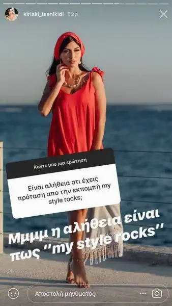 Απάντηση στις φήμες αυτές έδωσε η ίδια μέσα από τα Instagram stories, με αφορμή σχετική ερώτηση follower της. «Είναι αλήθεια ότι έχεις πρόταση από την εκπομπή My Style Rocks;», έγραψαν στην Κυριακή με την ίδια να απαντά: