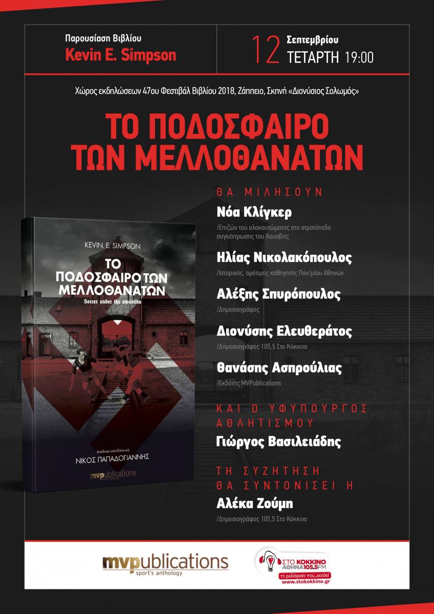Ο 105,5 Στο Κόκκινο πραγματοποιεί για δεύτερη συνεχή χρονιά την πρώτη εκδήλωση της νέας σεζόν από το Φεστιβάλ Βιβλίου στο Ζάππειο και σε συνεργασία με τις εκδόσεις MVPublications, θα παρουσιάσουν την Τετάρτη 12 Σεπτεμβρίου, στις 19:00, στο χώρο εκδηλώσεων του 47ου Φεστιβάλ Βιβλίου 2018, σκηνή «Διονύσιος Σολωμός», το βιβλίο: «Το ποδόσφαιρο των μελλοθάνατων» του Kevin Simpson σε μετάφραση Νίκου Παπαδογιάννη.