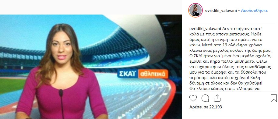 Ο λόγος για την Ευριδίκη Βαλαβάνη, η οποία μετά από 13 χρόνια στον ΣΚΑΙ, ανακοίνωσε την αποχώρηση της από τον σταθμό, μέσα από μια ανάρτηση που έκανε στον προσωπικό της λογαριασμό στο Instagram.