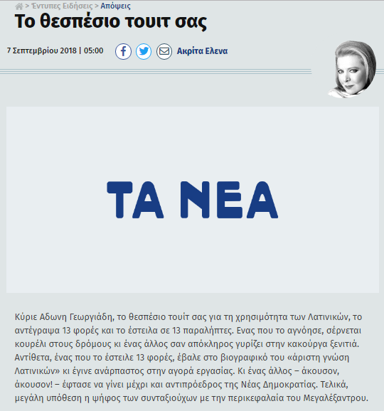 «Κύριε Αδωνη Γεωργιάδη, το θεσπέσιο τουίτ σας για τη χρησιµότητα των Λατινικών, το αντέγραψα 13 φορές και το έστειλα σε 13 παραλήπτες. Ενας που το αγνόησε, σέρνεται κουρέλι στους δρόµους κι ένας άλλος σαν απόκληρος γυρίζει στην κακούργα ξενιτιά. Αντίθετα, ένας που το έστειλε 13 φορές, έβαλε στο βιογραφικό του “άριστη γνώση Λατινικών” κι έγινε ανάρπαστος στην αγορά εργασίας. Κι ένας άλλος – άκουσον, άκουσον! – έφτασε να γίνει µέχρι και αντιπρόεδρος της Νέας Δηµοκρατίας. Τελικά, µεγάλη υπόθεση η ψήφος των συνταξιούχων µε την περικεφαλαία του Μεγαλέξαντρου».