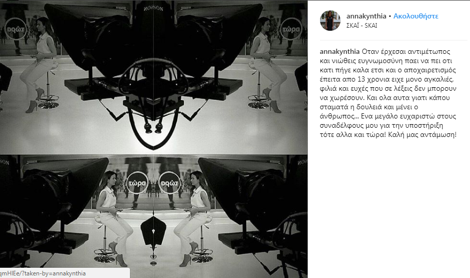Ο λόγος για την Άννα Μπουσδούκου, η οποία δημοσίευσε στον προσωπικό της λογαριασμό στο Instagram, ένα κολάζ με φωτογραφίες, το οποίο συνόδευσε με την εξής λεζάντα: «Όταν έρχεσαι αντιμέτωπος και νιώθεις ευγνωμοσύνη παει να πει οτι κατι πήγε καλα ετσι και ο αποχαιρετισμός έπειτα απο 13 χρονια ειχε μονο αγκαλιές, φιλιά και ευχές που σε λέξεις δεν μπορουν να χωρέσουν. Και ολα αυτα γιατι κάπου σταματά η δουλειά και μένει ο άνθρωπος… Ενα μεγάλο ευχαριστώ στους συναδέλφους μου για την υποστήριξη τότε αλλα και τώρα! Καλή μας αντάμωση».