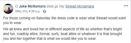 Ο αδερφός της Τζέικ έγραψε στην ανάρτησή του στο Facebook λεπτομέρειες της τελετής αποχαιρετισμού, όπου εξηγούσε ότι η αδελφή του θα ήθελε να ντυθούν όπως θα ντυνόταν κι εκείνη.